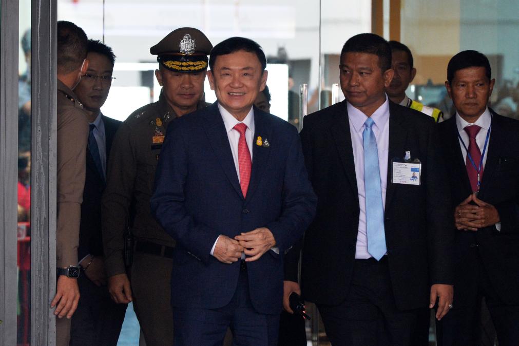 2023年8月22日,泰國(guó)前總理他信(中)抵達(dá)曼谷廊曼機(jī)場(chǎng)。新華社發(fā)(拉亨攝)