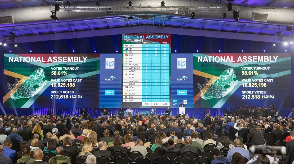 6月2日,在南非米德蘭的大選計票中心,電子顯示屏顯示南非大選最終計票結果。新華社記者張譽東攝