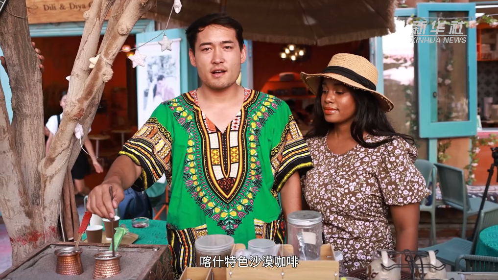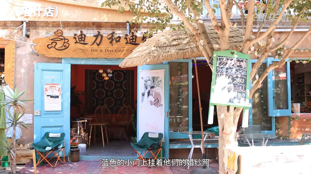 咖啡館木制的門頭雕刻著夫妻倆的名字,藍(lán)色的小門上掛著他們的婚紗照,照片里的海迪雅來自非洲東部坦桑尼亞桑給巴爾島,迪力夏提是新疆喀什本地人。