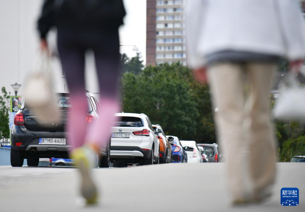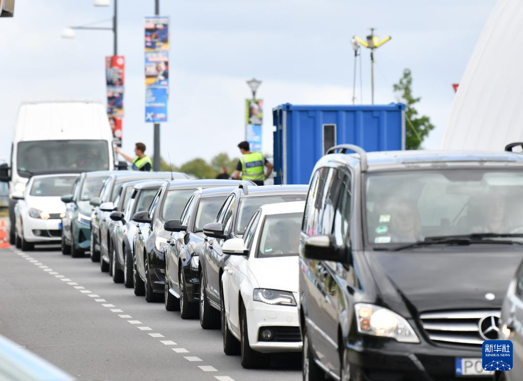 9月10日,車輛排隊(duì)通過德國奧得河畔法蘭克福和波蘭斯武比采邊境的檢查站。新華社記者 任鵬飛 攝