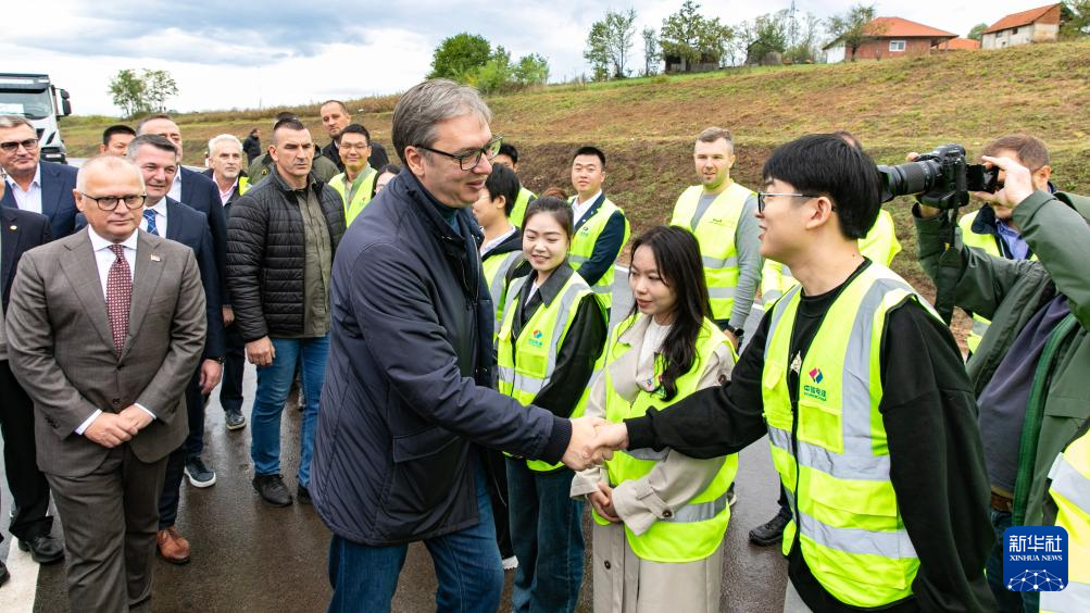 10月4日,在塞爾維亞中部城市上米拉諾瓦茨,塞爾維亞總統(tǒng)武契奇(中)在出席中企承建的繞城公路通車(chē)儀式時(shí)與項(xiàng)目建設(shè)者握手。新華社發(fā)(王韡攝)