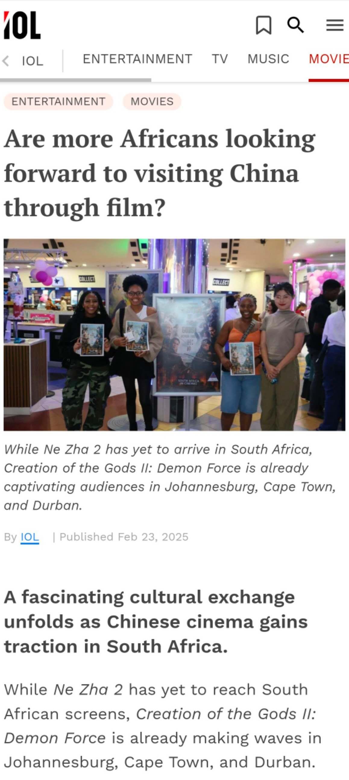 電影連接世界,這一次,非洲大陸期待著《哪吒2》的到來(lái),曼德拉廣場(chǎng)上舞動(dòng)著南非版的“魔童鬧?!薄侵迺r(shí)刻已到——This time for Africa!