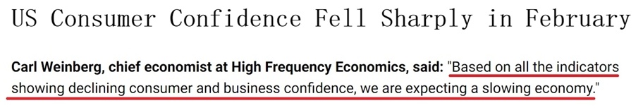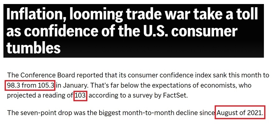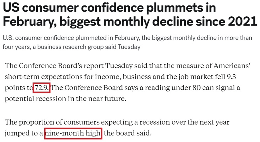 各家媒體紛紛用“暴跌”“直線下降”“急劇惡化”等詞匯來(lái)形容美國(guó)消費(fèi)者信心的顯著下滑。