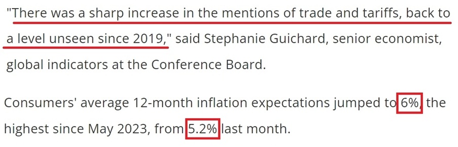 在美國(guó)CCI以三年半以來(lái)的最大速度惡化的同時(shí),美國(guó)消費(fèi)者對(duì)未來(lái)一年的通脹預(yù)期也從5.2%大幅升高至6%,達(dá)到2023年5月以來(lái)的最高水平。這進(jìn)一步顯示,美國(guó)人對(duì)特朗普政府政策可能對(duì)經(jīng)濟(jì)造成的負(fù)面影響越來(lái)越擔(dān)憂。