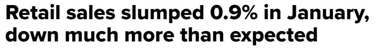 與此相應(yīng)地,美國(guó)1月零售額環(huán)比下降0.9%,大大超出此前下降0.2%的預(yù)期,創(chuàng)下近兩年來(lái)的最大月度環(huán)比跌幅。
