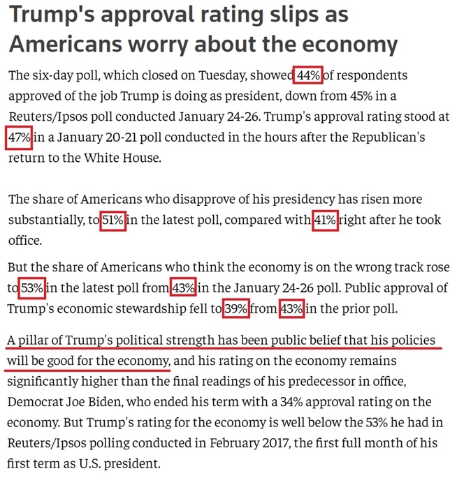 根據(jù)路透社與益普索集團(tuán)聯(lián)合進(jìn)行的一項(xiàng)最新民調(diào)結(jié)果,對(duì)特朗普的總統(tǒng)工作表示認(rèn)可的受訪美國(guó)人比例已從他剛剛重返白宮后的47%降至44%,而不滿意他工作的受訪者比例則從他剛剛上任時(shí)的41%大幅上升到了51%。