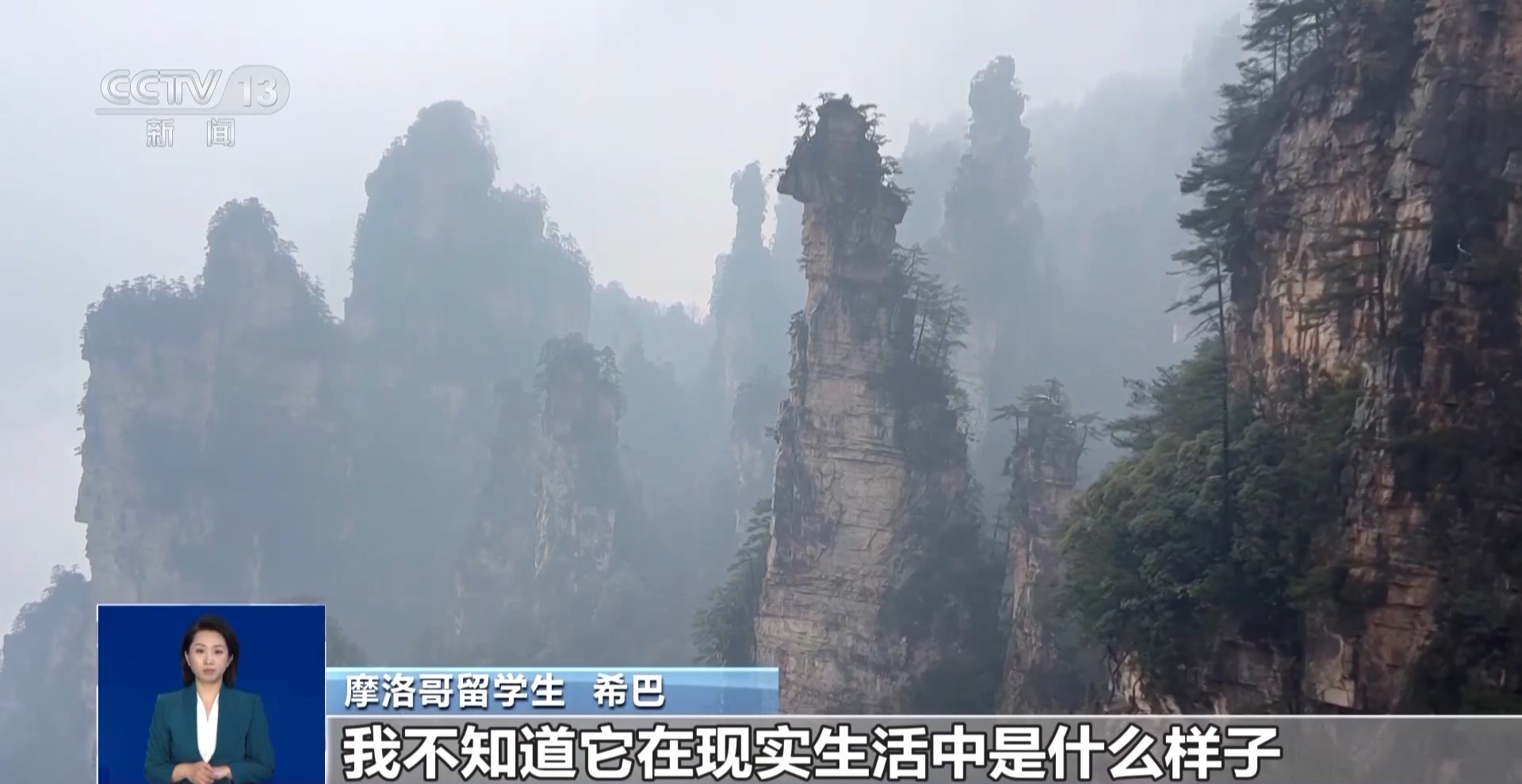 摩洛哥留學(xué)生 希巴:看完電影后我想去張家界,我不知道它在現(xiàn)實生活中是什么樣子,但它看起來就像天堂,整個水域,山脈,一切都非常棒,美麗。