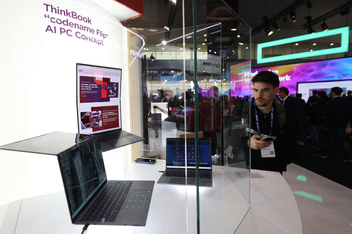 3月3日,在西班牙巴塞羅那舉行的2025年世界移動通信大會上,一名男子在聯(lián)想展區(qū)參觀外折屏筆記本電腦ThinkBook Flip AI PC概念機(jī)。(圖片來源:新華社)