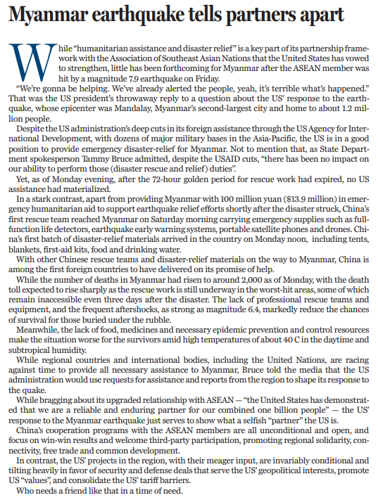 “人道主義援助和救災”是美國與東盟伙伴關系的重要內容,美國也信誓旦旦地宣稱要加強救援合作,但截至3月31日下午,緬甸地震72小時救援黃金時間已經過去,緬甸當?shù)厝晕闯霈F(xiàn)美國救援隊的身影。