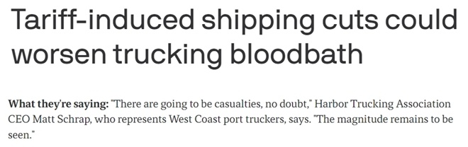 港口卡車運輸協(xié)會首席執(zhí)行官馬特·施拉普表示,關(guān)稅政策若繼續(xù)下去,將嚴重影響整個物流行業(yè),“卡車公司將失去業(yè)務(wù),倉庫也沒有存儲業(yè)務(wù),甚至連碼頭裝卸工也沒有那么多工作了”。
