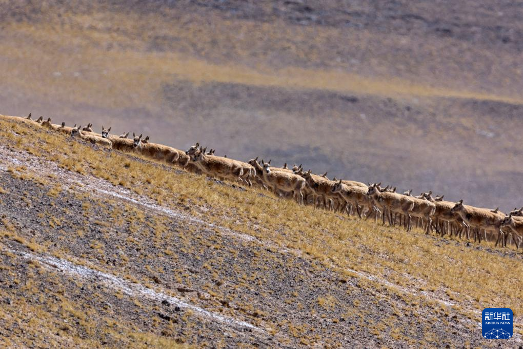 在羌塘國家級自然保護(hù)區(qū)核心區(qū)拍攝的遷徙中的雌藏羚羊群(6月9日攝)。新華社記者 旦增尼瑪曲珠 攝