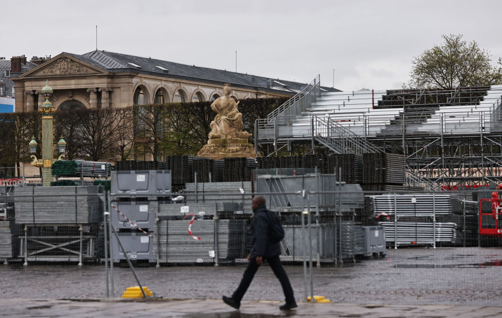 4月2日,行人經(jīng)過法國巴黎協(xié)和廣場的奧運(yùn)比賽場地和看臺建設(shè)工地。新華社記者 高靜 攝