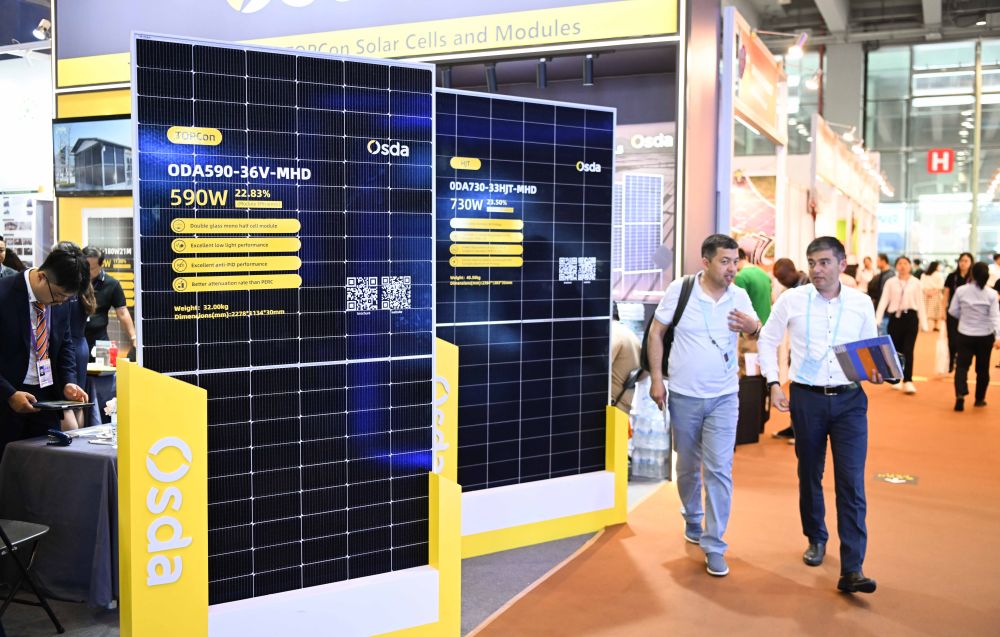 在創(chuàng)維公司的展廳,眾多客商圍觀一款可以由直面屏變?yōu)榍嫫恋淖冃坞娨暋3译娡?,公司還專設(shè)新能源光伏的展區(qū)。創(chuàng)維公關(guān)負責人孫妮介紹說:“四年內(nèi),創(chuàng)維新能源業(yè)務從無到有,目前達到約234億元的規(guī)模?!泵鎸θ蚬夥皟δ茴I(lǐng)域的巨大市場機遇,創(chuàng)維集團積極推進新能源業(yè)務出海,現(xiàn)已布局到澳大利亞、墨西哥、南非等27個國家和地區(qū)。