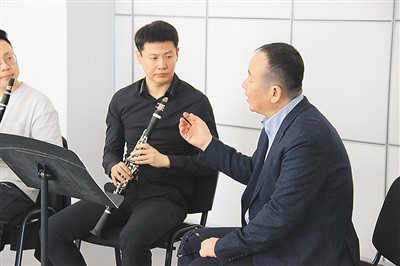 中國(guó)交響樂團(tuán)副團(tuán)長(zhǎng)、單簧管首席尹波(右一)指導(dǎo)新疆藝術(shù)學(xué)院學(xué)生。