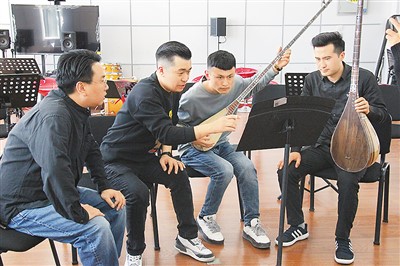 新疆藝術(shù)學(xué)院師生為中國(guó)交響樂團(tuán)作曲家楊帆(左一)展示彈撥爾樂器。