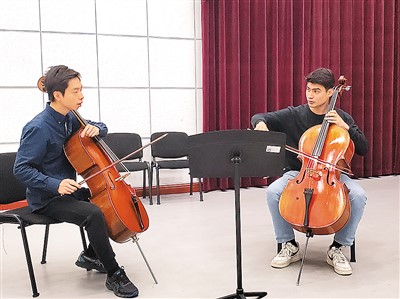 中國(guó)交響樂團(tuán)大提琴副首席李成(左)指導(dǎo)新疆藝術(shù)學(xué)院學(xué)生。