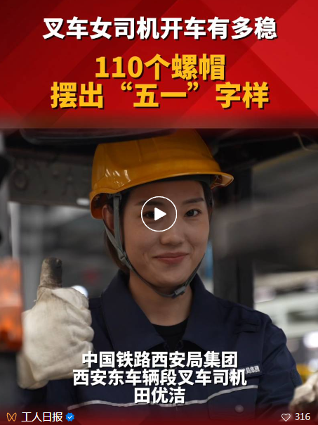 “95后”姑娘田優(yōu)潔是中國鐵路西安局集團有限公司西安東車輛段的一名叉車司機,平時的主要工作就是駕駛叉車完成車鉤的裝卸作業(yè)?!拔逡弧眹H勞動節(jié)之際,田優(yōu)潔開著叉車用110個螺帽擺出了“五一”字樣,這技術,真的穩(wěn)!