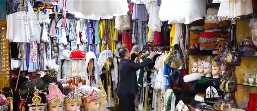 在總臺(tái)2024年春晚舞臺(tái)上,演員們身穿特色服飾進(jìn)行表演,驚艷全場(chǎng)。春晚過后,慕名前來購買和定制艾特萊斯服飾的游客不斷增加。努爾·買買提原本在當(dāng)?shù)亟?jīng)營一家數(shù)碼產(chǎn)品店鋪,看到旅拍店艾特萊斯服飾等傳統(tǒng)民族服裝的租賃和定制需求增加,他便在喀什古城開了一家民族服裝綜合店。