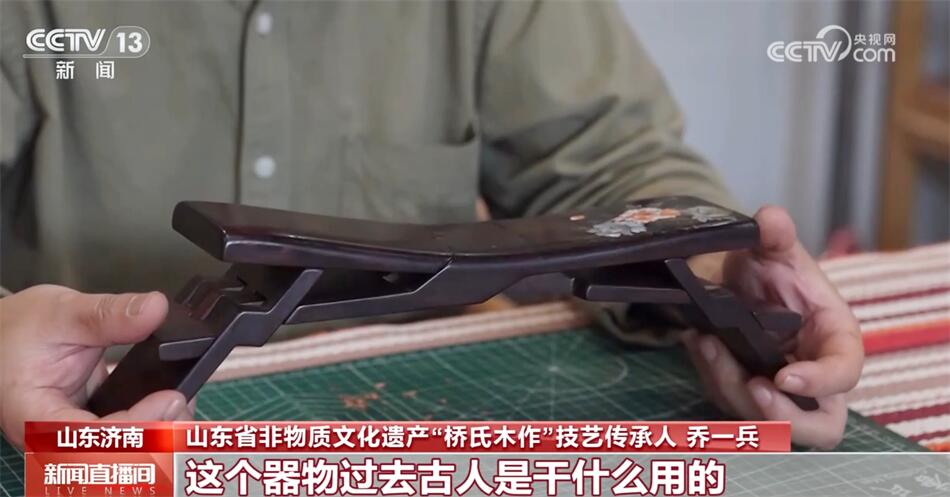 山東省非物質(zhì)文化遺產(chǎn)“橋氏木作”技藝傳承人喬一兵在工作站里也有自己的工作室,他用一整塊木料,不用一釘一鉚,制作魯班枕結(jié)構(gòu)的系列用品。