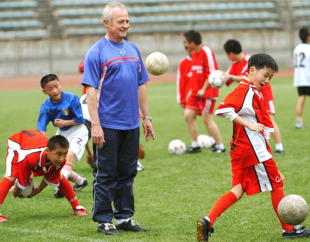 ↑2004年4月11日,法國青少年足球?qū)<野稀っ仔獱枴び诋斚#ㄖ校谫F陽輔導小學員訓練。
