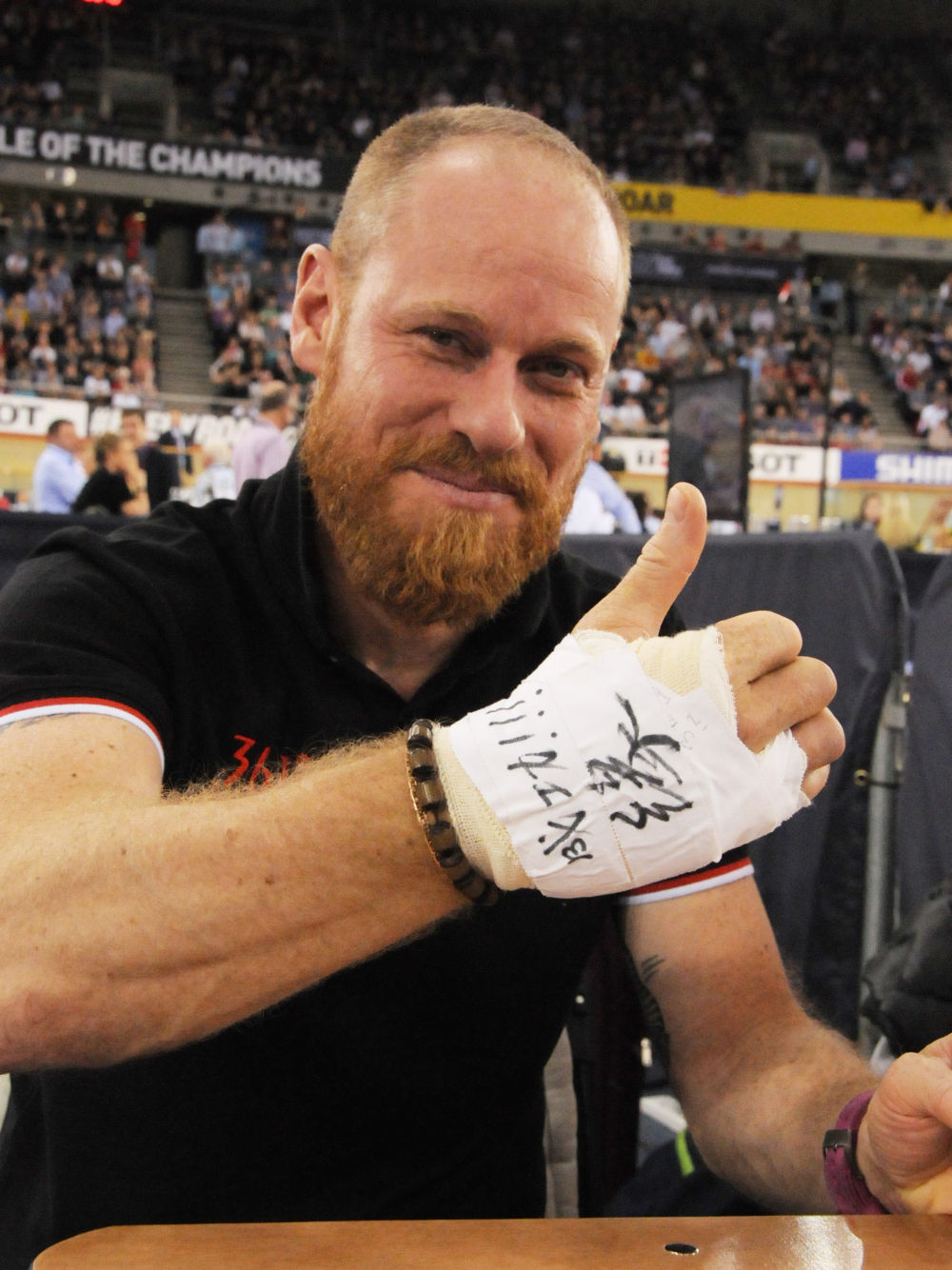 ↑2016年3月6日,2016場地自行車世錦賽賽場上,中國隊的法國籍教練韋蒂展示右手繃帶上的漢字“成功?。。【墶?。