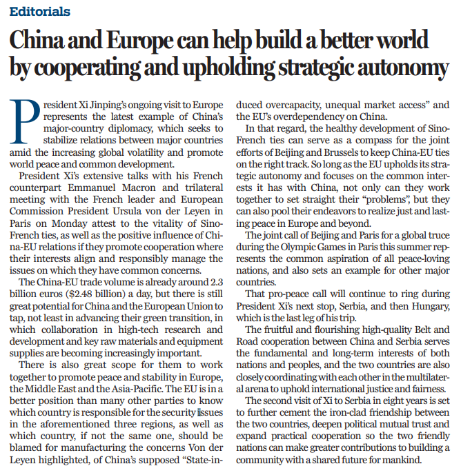 中國領(lǐng)導(dǎo)人此次歐洲之行旨在全球局勢日益動蕩之際穩(wěn)定大國關(guān)系和中歐關(guān)系,促進(jìn)世界和平與共同發(fā)展。在促進(jìn)歐洲、中東和亞太地區(qū)的和平與穩(wěn)定方面,中歐雙方有很大的合作空間。只要?dú)W盟堅(jiān)持戰(zhàn)略自主,著眼于中歐共同利益,雙方不僅可以攜手合作,還可以為實(shí)現(xiàn)歐洲和歐洲以外地區(qū)公正與持久的和平共同努力,為世界和平與發(fā)展以及人類的進(jìn)步作出新的貢獻(xiàn)。