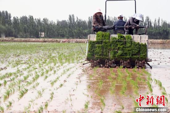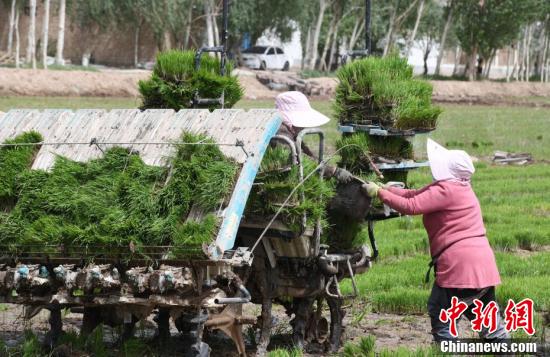 5月13日,在位于該市帕哈太克里鄉(xiāng)的“海水稻”種植基地,各類機(jī)械和工作人員都忙碌起來,搶抓農(nóng)時進(jìn)行“海水稻”播種工作。隨著氣溫回升,新疆喀什市的1.3萬畝“海水稻”進(jìn)入插秧期。圖為工作人員駕駛著插秧機(jī),搶抓農(nóng)時進(jìn)行“海水稻”播種工作。