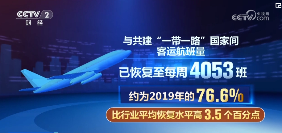 與共建“一帶一路”國家間客運航班量已恢復至每周4053班,約為2019年的76.6%,比行業(yè)平均恢復水平高3.5個百分點。