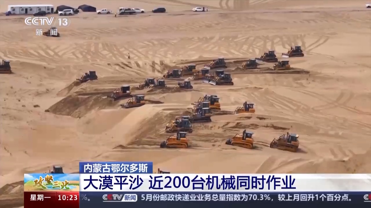 此刻,在我身后,近200臺(tái)推土機(jī)正在這片沙漠上來回穿行,他們要把這些高低起伏、連綿不斷的沙丘推平整了,再安裝光伏板。這么多推土機(jī)具體是如何作業(yè)的?技術(shù)人員告訴我們,因?yàn)榈匦蔚脑?,今天現(xiàn)場的推平作業(yè)大致分為兩個(gè)梯隊(duì):第一梯隊(duì)負(fù)責(zé)在沙丘的最上面,把頂部的沙子推下來;第二梯隊(duì)隨后,填平沙坑,平整現(xiàn)場。