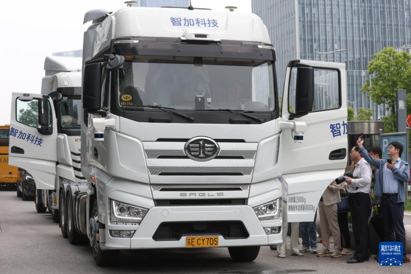 6月1日,人們?cè)趨⒂^兩輛由蘇州智加科技有限公司與車企共同開(kāi)發(fā)的智能駕駛重型卡車。新華社記者 楊磊 攝