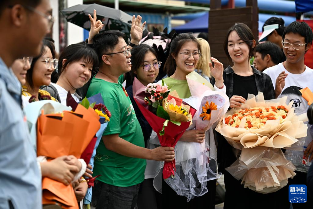 6月8日,在河南省焦作市博愛縣第一中學(xué)考點(diǎn),家長為走出考場的孩子送上鮮花。新華社發(fā)(程全攝)