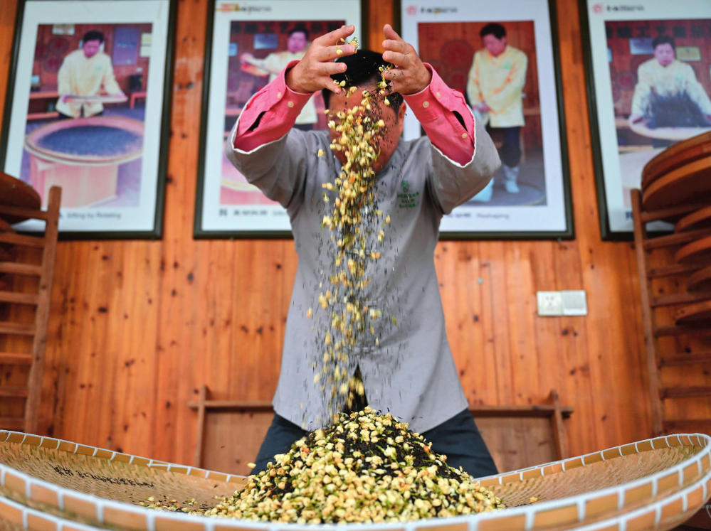 在福州茉莉花茶制茶工坊,福州茉莉花茶傳統(tǒng)窨制工藝大師傅天甫進行制茶的第六道工序“窨”(2022 年12 月 16 日攝)周義攝 / 本刊