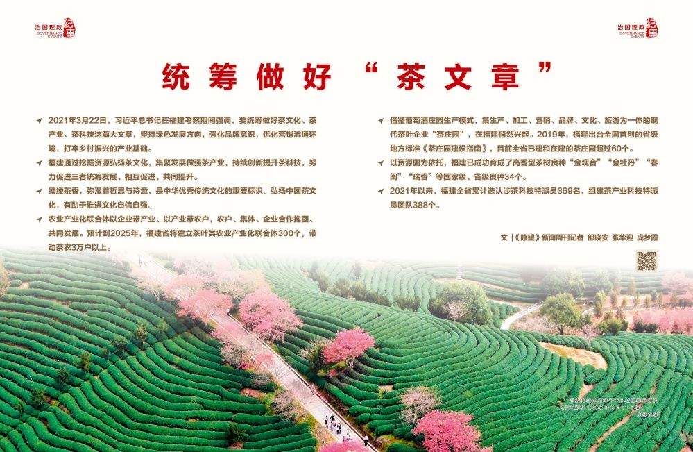 2021年3月22日,習近平總書記在福建考察期間強調,要統(tǒng)籌做好茶文化、茶產業(yè)、茶科技這篇大文章,堅持綠色發(fā)展方向,強化品牌意識,優(yōu)化營銷流通環(huán)境,打牢鄉(xiāng)村振興的產業(yè)基礎。