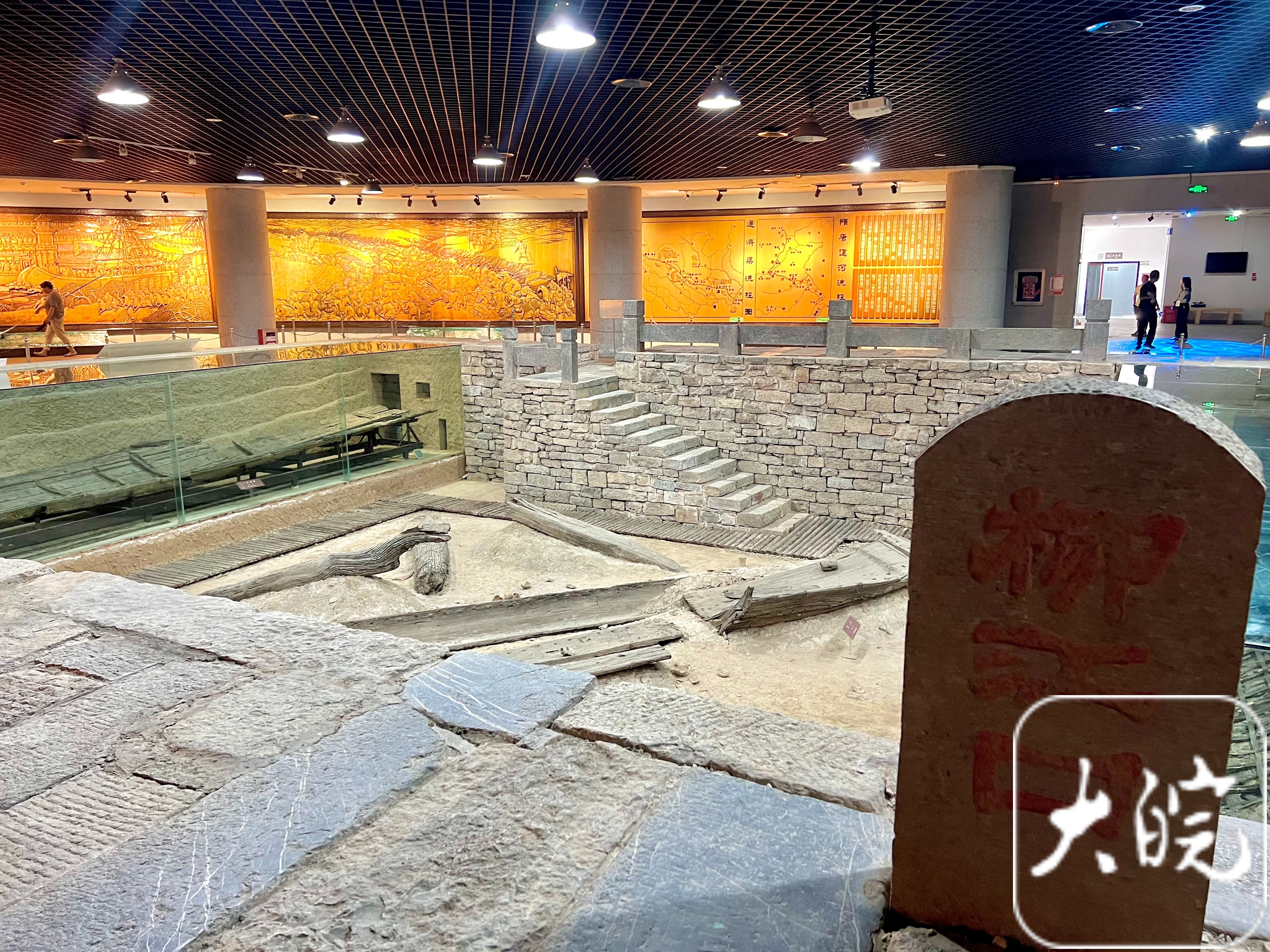 值得一提的是,館內(nèi)還復(fù)原了柳孜運(yùn)河遺址?,F(xiàn)場不僅能看到千年前的柳江口碼頭,還能看到“淮北舵”唐代貨船和唐代獨木舟。零散的船板、傾斜的木樁、散落的瓷器,再現(xiàn)了發(fā)掘時的現(xiàn)場實景,給人身臨其境之感。