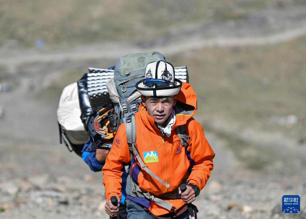 7月4日,塔西巴伊(左二)背著約25公斤的物品和同伴一起行進(jìn)在慕士塔格峰的山坡上。新華社記者 胡虎虎 攝