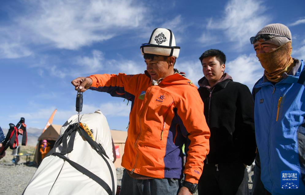 7月4日,在新疆慕士塔格峰一處登山營(yíng)地,塔西巴伊(左)將登山者的物品稱重。高山搬運(yùn)依據(jù)不同海拔路程對(duì)所背物品按重量收取費(fèi)用。新華社記者 胡虎虎 攝