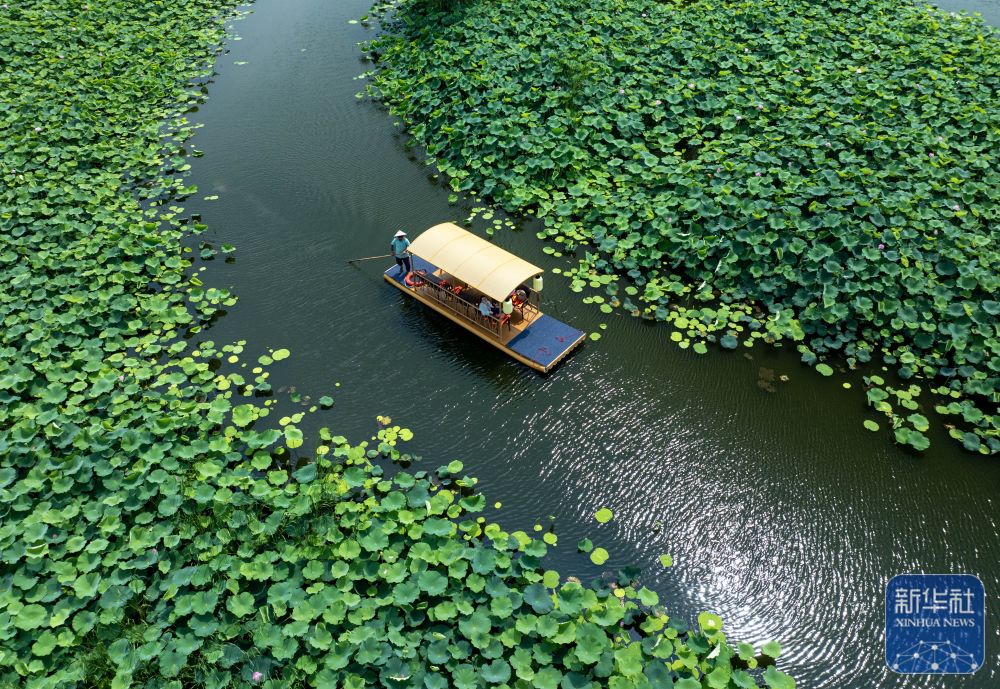 7月8日,游客在江蘇省興化市千垛鎮(zhèn)的萬畝荷塘景區(qū)賞荷游玩(無人機照片)。新華社發(fā)(周社根 攝)