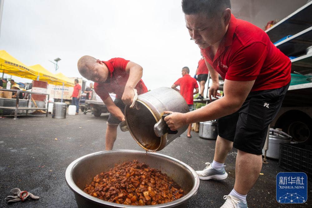 7月10日,在岳陽(yáng)市良心堡鎮(zhèn)望君洲村,志愿者在炒菜。新華社記者 陳澤國(guó) 攝