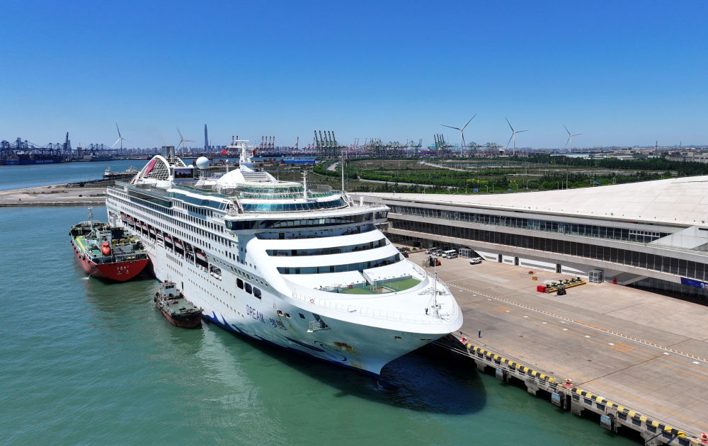 5月15日,“夢(mèng)想”號(hào)郵輪停靠在天津國際郵輪母港(無人機(jī)照片)。新華社記者 趙子碩 攝