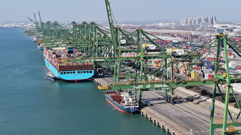 圖為2月3日拍攝的天津港集裝箱碼頭(無人機(jī)照片)。新華社記者 趙子碩 攝