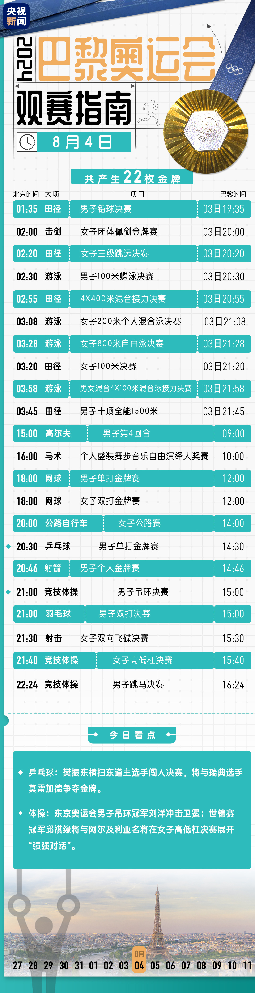 巴黎奧運會第九個比賽日將產生20枚金牌。中國體育代表團將在乒乓球、羽毛球等項目上沖擊金牌。