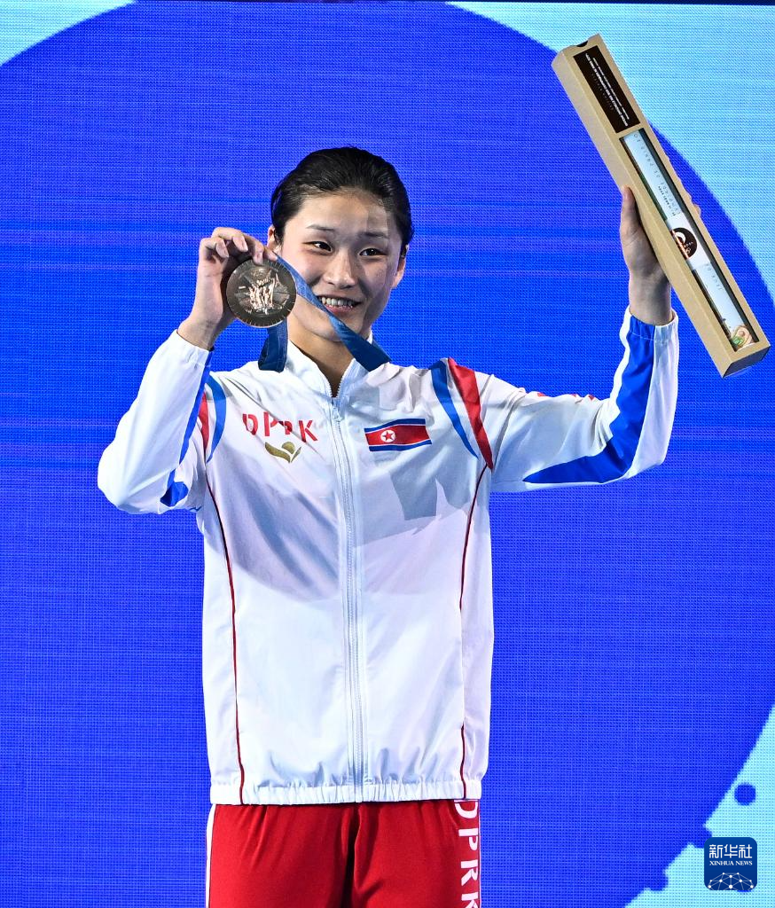 8月6日,冠軍中國選手全紅嬋(中)、亞軍中國選手陳芋汐(左)、季軍朝鮮選手金姬燕在頒獎儀式后合影。新華社記者 王鵬 攝