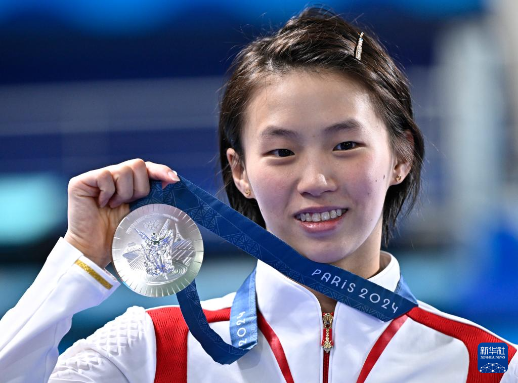 8月6日,陳芋汐展示銀牌。新華社記者 王鵬 攝