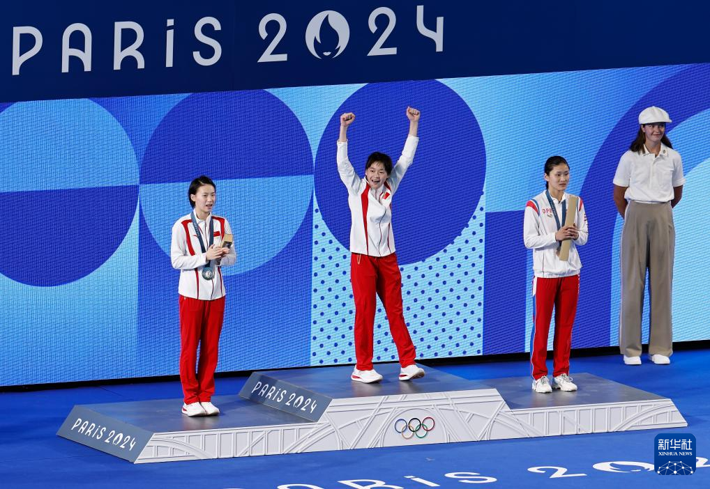 8月6日,冠軍中國選手全紅嬋(前中)、亞軍中國選手陳芋汐(前左)、季軍朝鮮選手金姬燕(前右)在頒獎儀式上。新華社記者 張玉薇 攝