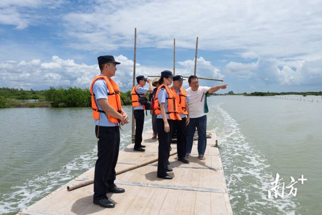 正是開(kāi)工的好時(shí)候。4人熟練地登上舢板,沿著海岸線劃行,駛往保護(hù)區(qū)深處一個(gè)養(yǎng)殖塘。他們不時(shí)站到船頭,仔細(xì)打量岸邊的紅樹(shù)林,不斷向魚(yú)塘主老黃問(wèn)話。