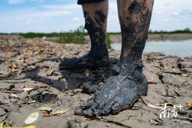 1個(gè)多月過(guò)去,補(bǔ)種的“樹(shù)寶寶”該做“體檢”了。日頭漸猛,潮漲起來(lái)了。“脫鞋蹚過(guò)去!”聽(tīng)著楊健宏的招呼,大家一腳踏進(jìn)泥地,一步一個(gè)腳印,泥土很快爬滿了小腿。