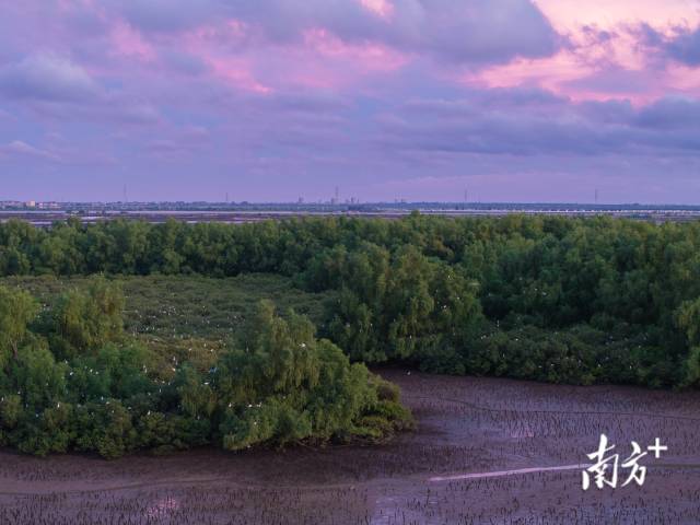 傍晚,晚霞鋪滿天空,一群群鷺鳥(niǎo)飛回紅樹(shù)林過(guò)夜。