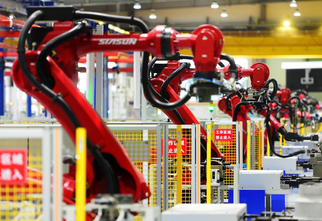 在某工業(yè)機器人生產(chǎn)線,機器人正在自主地抓取各種零部件,快速組裝稍小的工業(yè)機器人。