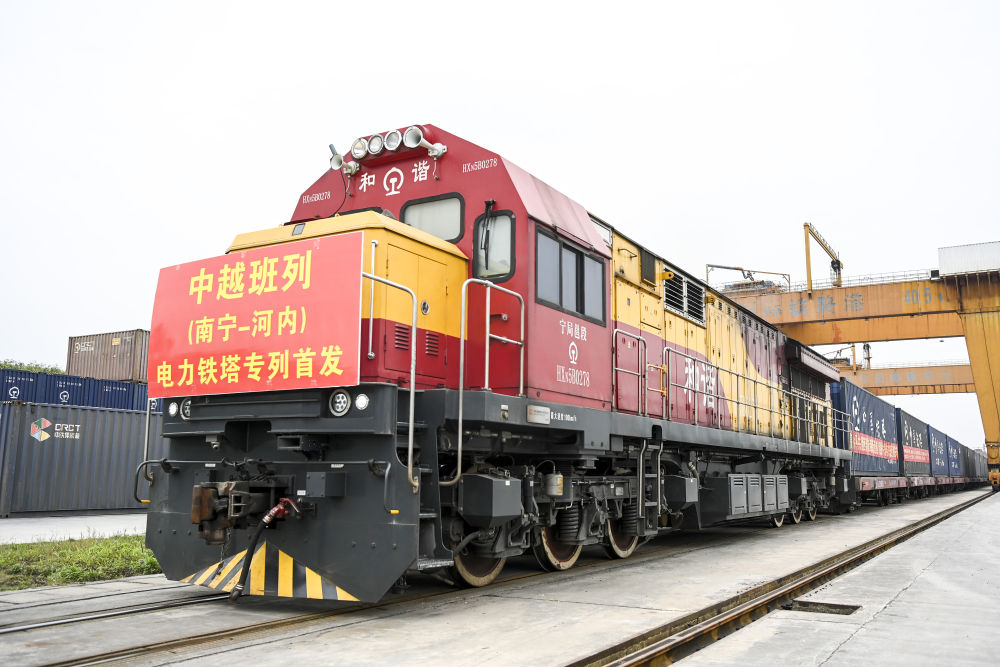 3月8日上午,一列滿載340噸電力鐵塔的中越班列從南寧國際鐵路港開出,發(fā)往越南河內(nèi)。這是廣西首次開行電力鐵塔專列。新華社記者曹祎銘 攝