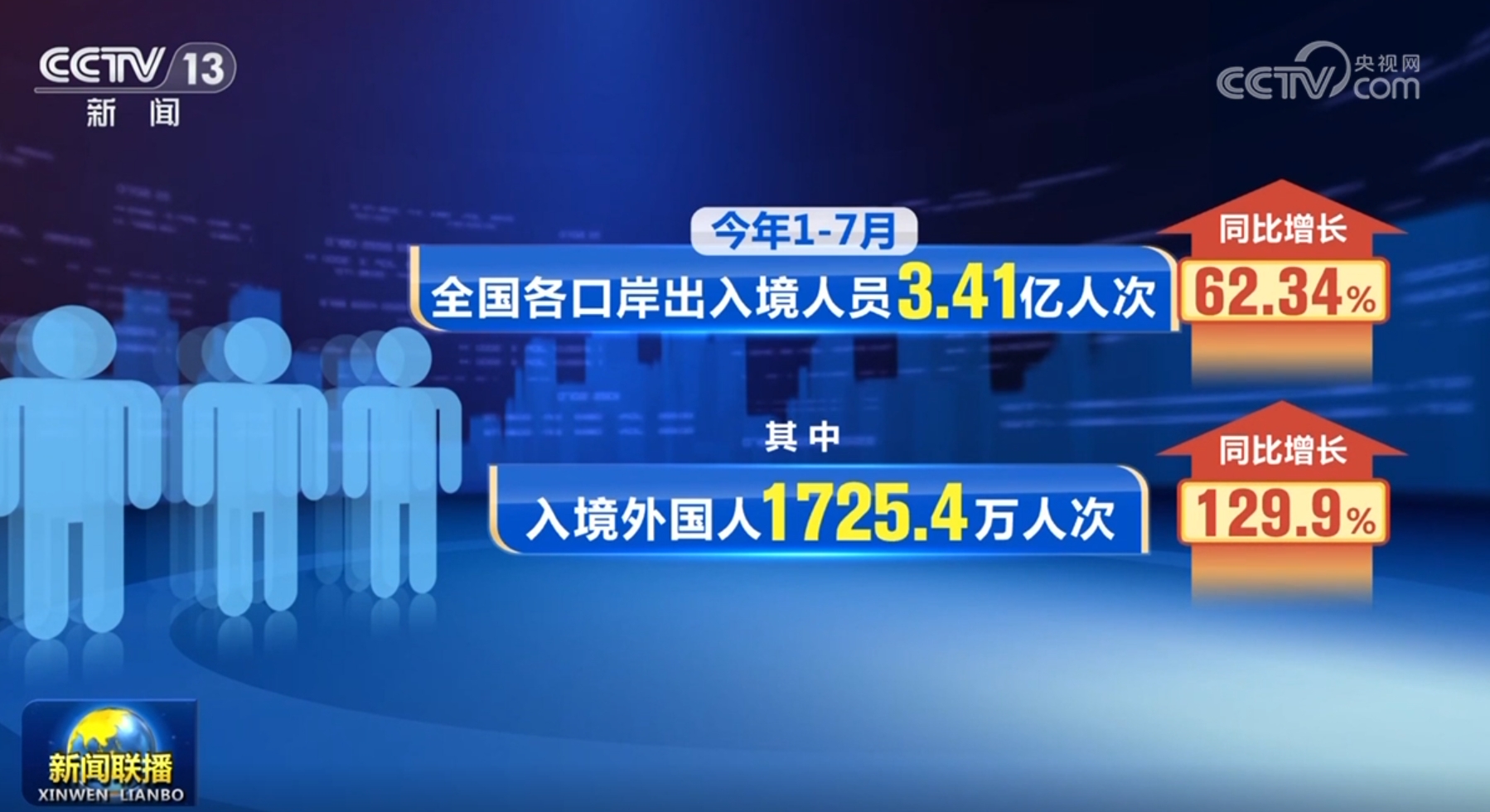 積極促進人員交流交往,先后出臺110余項便利外籍人員來華政策措施。目前,144小時過境免簽政策適用范圍已增至37個口岸、54個國家。今年1—7月,全國各口岸出入境人員3.41億人次,同比增長62.34%,其中入境外國人1725.4萬人次,同比增長129.9%。